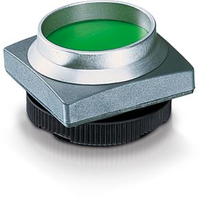 RAFIX 22 FS+, illuminated pushbutton, protruding front ring, square collar, momentary contact function, frontring slate gray, bezel green